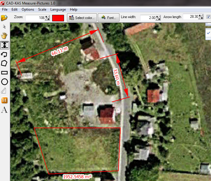 Per prima cosa è necessario specificare la scala inserendo la lunghezza di un tratto conosciuto. Adesso è possibile misurare la lunghezza di una singola linea o la lunghezza totale di un insieme di linee. Un'altra possibilità è quella di misurare l'area e il perimetro di un poligono, un rettangolo, un cerchio o un'ellisse, tracciando le linee direttamente sull'immagine e spostandole o modificandole successivamente. Si può anche inserire una didascalia per ogni elemento, o aggiungere testi in qualsiasi punto dell'immagine.