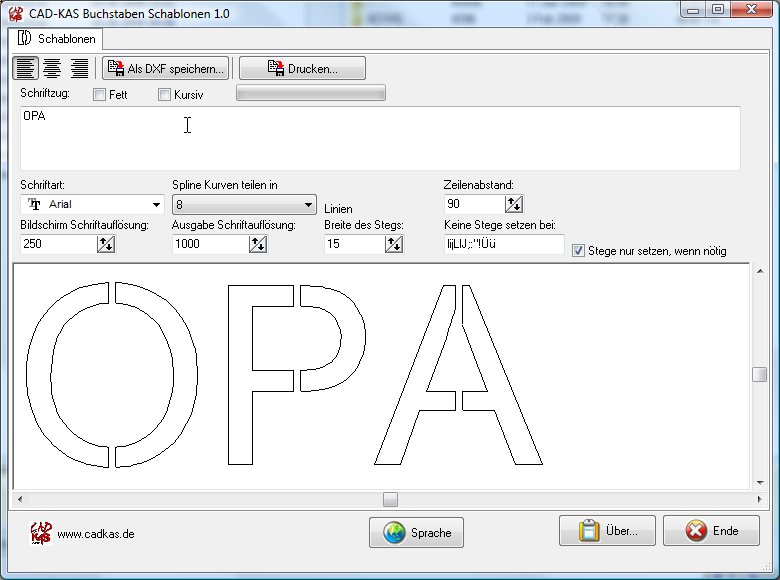 Fügen Sie Stege in die normalen Buchstaben einer jeden Windows Schriftart ein, um diese als Schablone ausdrucken oder als DXF exportieren zu können.