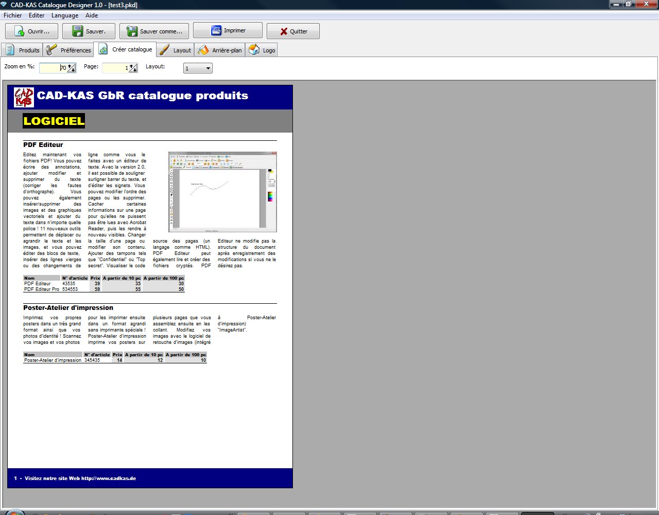 Dans la version de démonstration vous ne pouvez rien sauver. A l'impression un texte de version de démonstration s'imprime en haut de la page.