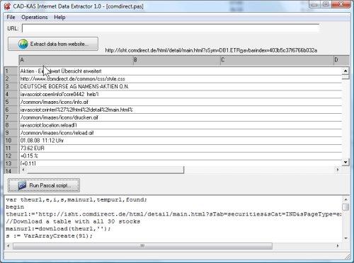 A real world example is available in the file comdirect.pas. This file will download all detail information of all 30 German DAX stocks and saves each one in a separate csv file on hard disk. The information is readed from the German website http://www.comdirect.de