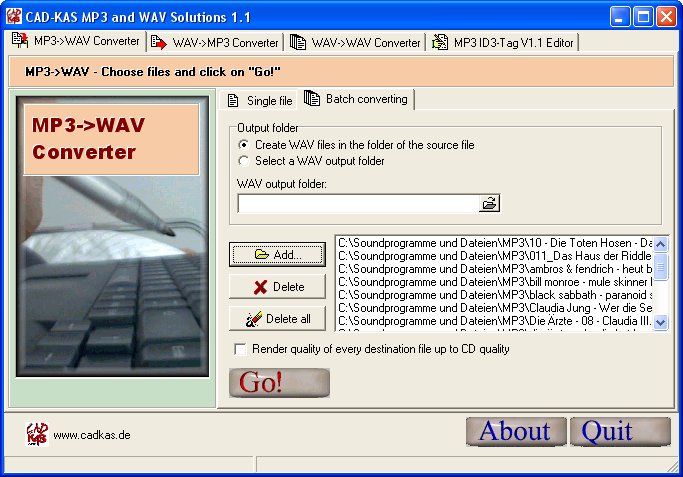 Converts MP3 files easily and quickly into WAV files and back. Convert many files with one click. You can change the sample rate of WAV files and the MP3 tag information of MP3 files. This program offers solutions for daily practice. If you want to burn a music CD you have to convert your MP3 files into WAV files. And if you want to create your own MP3 files you have to record the music as WAV file first. Than you have to save the information about title etc. in the MP3 file. The program offers solutions for all these steps.