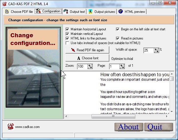 You can't simply open PDF files in Word and edit them... Wrong! PDF 2 HTML can open PDF files. It recognizes the texts, the layout and many graphics. Then you can save this as HTML, RTF or TXT file. You can open these files in Word or Frontpage etc. So you are ready to upload your documents to the internet. And anybody can view HTML files instantly. You can create text versions of you PDF documents and use the Windows search functions to find text in all your PDF documents. All information are immediately available and searchable! Visually impaired people are able to get the information with screen readers if you support them with html or text only versions of your documents!