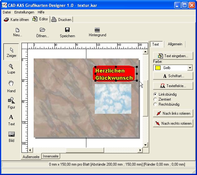 Erstellen Sie eigene Grußkarten, Glückwunschkarten und Einladungskarten am Computer und drucken Sie diese aus! Eine selbst entworfene Karte kommt immer besser an als eine gekaufte Karte. Vor allem wenn man z.B. noch Erinnerungsfotos als Kartenmotiv wählt. Sie können in dem Programm Ihre eigenen Karten gestalten und ausdrucken. Dann schneiden Sie die Karte einfach aus und falten diese einmal in der Mitte - fertig ist die persönliche Grußkarte!
