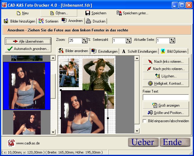 Nutzen Sie Ihren Drucker optimal und drucken Sie Ihre Fotos und Bilder mit CAD-KAS Foto-Drucker! Das Programm erlaubt es Ihnen, Collagen aus Ihrem Bildmaterial zu erstellen. Sie können Bilder beliebig auf dem Arbeitsblatt anordnen und in der Größe ändern. Das Programm ordnet die Bilder auf Wunsch auch automatisch an. Sie können zu jedem Bild einen freien Text schreiben oder den Dateinamen einblenden lassen.