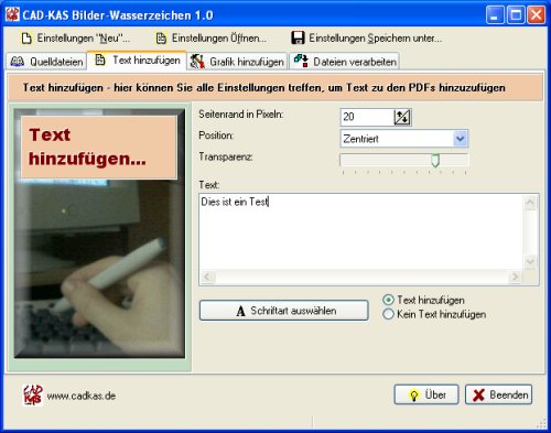 Schützen Sie Ihre Bilder effektiv gegen Diebstahl, denn Wasserzeichen lassen sich nicht so einfach entfernen, wenn diese an der richtigen Stelle plaziert werden. Fügen Sie Ihren Bildern ein sichtbares, durchsichtiges Wasserzeichen als Text und/oder als Bild hinzu. Sie können also nicht nur einen Text einblenden, sondern auch Ihr Logo halbdurchsichtig einblenden lassen. Wie durchsichtig der Text sein soll, bestimmen Sie dabei selber. Es sind also auch komplett undurchsichtige Texte und Bilder möglich. Das Programm kann beliebig viele Dateien in der Stapelverarbeitung per Knopfdruck verarbeiten.