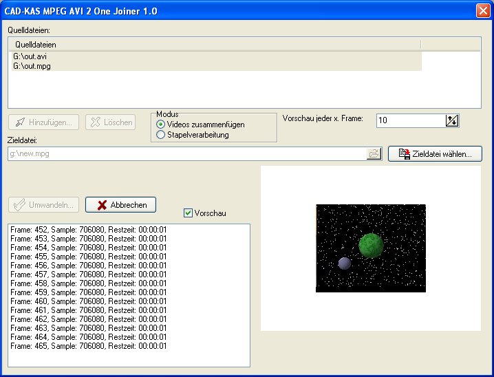 Fügen Sie Ihre Videodateien (MPEG und AVI) zu einer großen Videodatei zusammen! Sie wählen einfach die AVI und MPG Videos zum Zusammenfügen und das Zielformat (MPEG oder AVI) aus. Das Programm fügt alle Videos zu einem großen Video zusammen.
