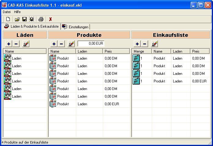 Jetzt wird nicht mehr jede Woche aufs Neue der Einkaufszettel für den Wocheneinkauf geschrieben. CAD-KAS Einkaufsliste ist ein Programm, das für verschiedene Läden die üblicherweise gekauften Waren mit einer Angabe der Preise speichert. So kann man sich jede Woche eine per Mausklick zusammengestellte Einkaufsliste mit Preisen und Ladengeschäft ausdrucken.