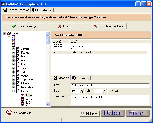 Übersichtlich werden alle Tage und Monate in einem Baumdiagramm, wie vom Windows Dateimanager bekannt, dargestellt. Sie können per Mausklick neue Termine hinzufügen, jeweils einen beliebigen Text dazu tippen und einstellen, wann und wie oft Sie vorher erinnert werden möchten. Das Programm läuft auf Wunsch im Hintergrund und erinnert Sie an Ihre Termine.