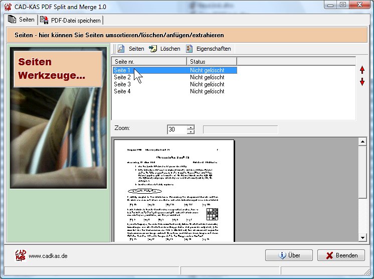 Wenn Sie nur PDF Dateien zusammenfügen wollen können Sie auch unser Programm PDFs zu One nehmen. Wenn sie noch ein wenig mehr Funktionen benötigen, wie z.B. Text ändern wollen oder Seiten Nummern hinzufügen wollen, dann brauchen Sie unseren PDF Editor. Alle Funktionen von PDF Split and Merge finden Sie dort in dem Reiter "Seiten".