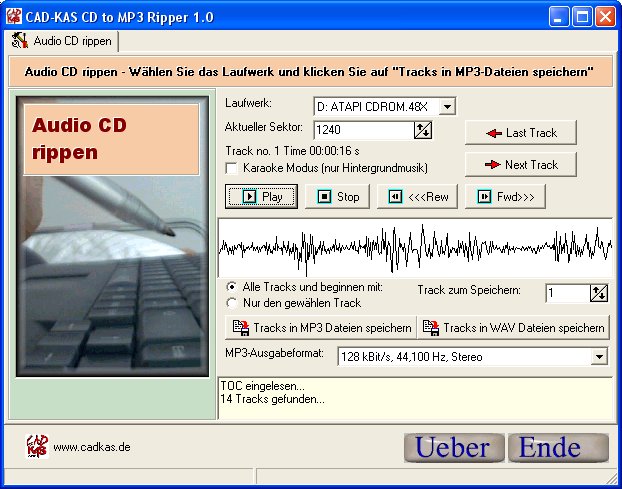 Mit dem CD Ripper mit Namen CD zu MP3 Ripper von CAD-KAS rippen Sie alle Lieder per Knopfdruck von Ihrer Audio CD und lesen diese in den Computer ein. Sie können dies als MP3 oder WAV speichern.