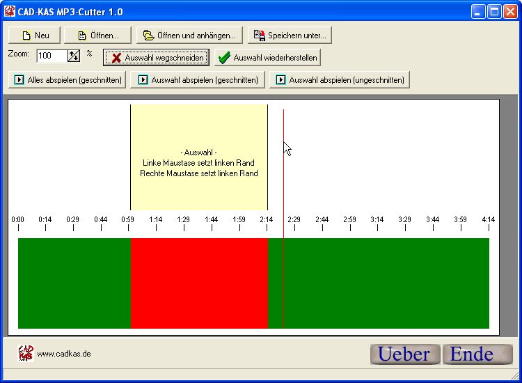 MP3's ohne Verluste zuschneiden und auch aneinander hängen ist mit MP3-Cutter problemlos möglich. Wenn Sie Musik als MP3 aufnehmen dann haben Sie später oft das Problem, dass unerwünschte Pausen oder gar Moderatoren Ansagen oder Werbung mit aufgenommen wurden sind. Markieren Sie einfach die Teile, die Sie entfernen wollen und drücken Sie auf "Herausschneiden". Dabei wird die MP3 Datei nicht neu kodiert, so dass keine Qualität durch eine erneute MP3 Codierung eingebüßt wird. Sie können mit dem Programm auch einfach mehrere MP3 Dateien zu einer großen MP3 Datei zusammenfügen.