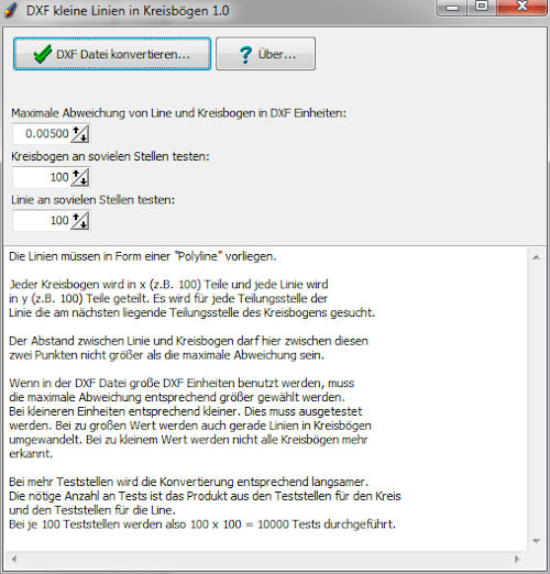 Wenn in der DXF Datei große DXF Einheiten benutzt werden, muss die maximale Abweichung entsprechend größer gewählt werden. Bei kleineren Einheiten entsprechend kleiner. Dies muss ausgetestet werden. Bei zu großen Wert werden auch gerade Linien in Kreisbögen umgewandelt. Bei zu kleinem Wert werden nicht alle Kreisbögen mehr erkannt.