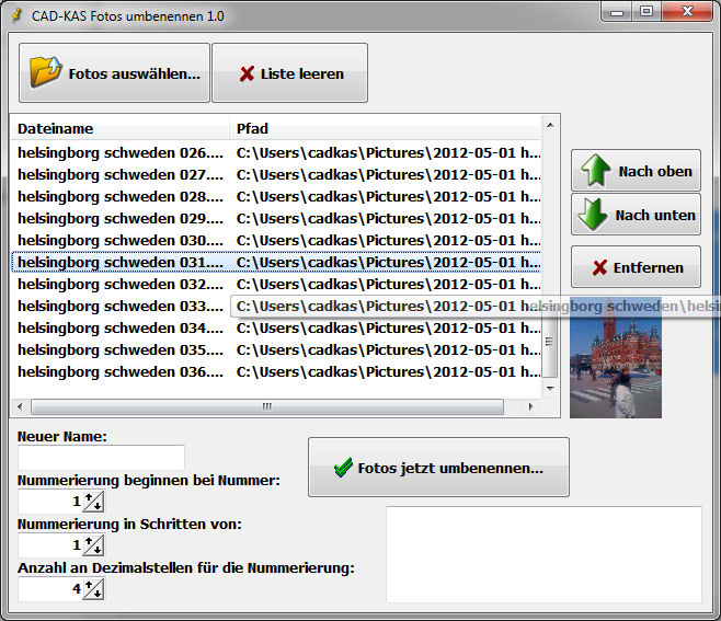 Das Programm benennt die Fotos, z.B. von der Digitalkamera oder dem Handy um. Sie wählen eine Reihe von Fotos aus. Sie können dann die Fotos noch umsortieren und erhalten eine Vorschau für die Fotos.