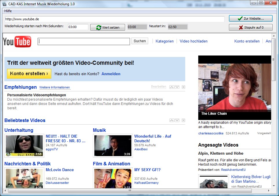Warum gibt es keine Endlosschleife? Genau dies macht dieses kleine Programme. Im Programm gehen Sie auf Ihr Video Portal und starten Ihr Video. Sie sehen dann wie lang das Video ist. Die Länge geben Sie ins Programm ein. Das Programm startet dann immer nach der eingegebenen Zeit das Video neu