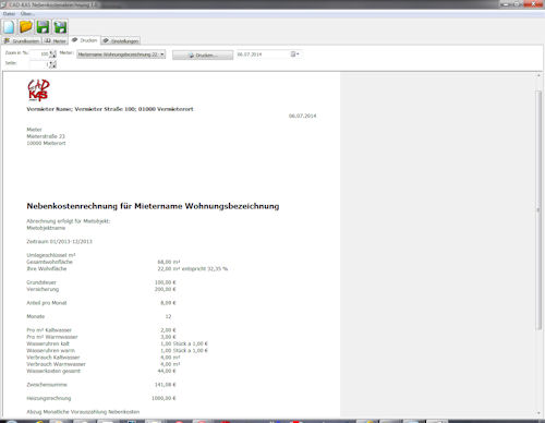 Das Ergebnis kann dann für jeden Mieter ausgedruckt werden. Für den Ausdruck kann ein eigenes Logo hinterlegt werden.