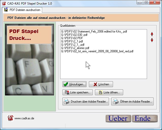 Wenn Sie oft viele PDF Dateien ausdrucken müssen, dann kann Ihnen dieses Programm helfen. Sie wählen nur die zu druckenden PDF Dateien aus und können auch die genaue Druckreihenfolge festlegen. Auf Knopfdruck wird aus den PDF Dateien eine große PDF Datei gemacht und der Adobe Reader wird aufgerufen, um die PDF Datei (also alle gewählten PDF Dokument zusammen) zu Drucken
