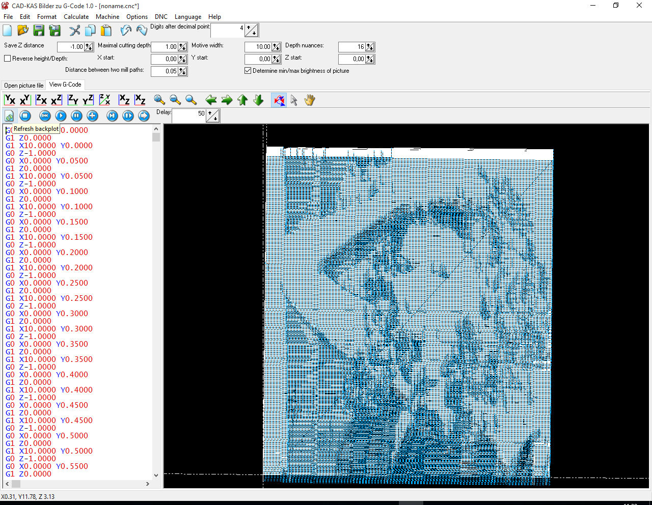 You only need to select the picture from hard disk. You get a preview of the G-Code on screen. You can then save the G-Code or edit it.