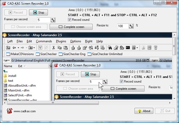 Record the screen action and create a mpeg or avi movie of all what happens on your screen. You can also select only a part of your screen to record. The program can record the sound together with the screen action. Select the sound recording device in your windows audio mixer. Up to Windows XP you can select the "Stereo mixer" device there and record everything your hear. The stereo mixer is no longer available in Windows Vista and Windows 7. In these windows versions you can use an audio cable to connect the audio output and audio input or use the microphone to record sound.