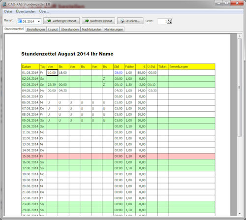 Die Stundenzettel lassen sich dann natürlich ausdrucken.