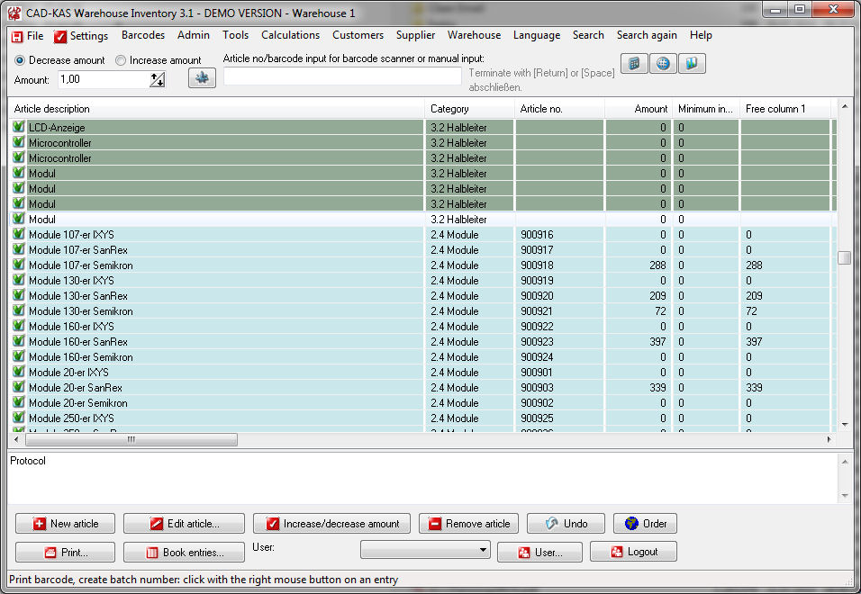 You can print your own barcodes with this software. If you click on the caption of a column the program sorts the articles according to this column. The program creates a protocol and a date base of every transaction. You can always see the exactly time and date and the user who made a transaction.